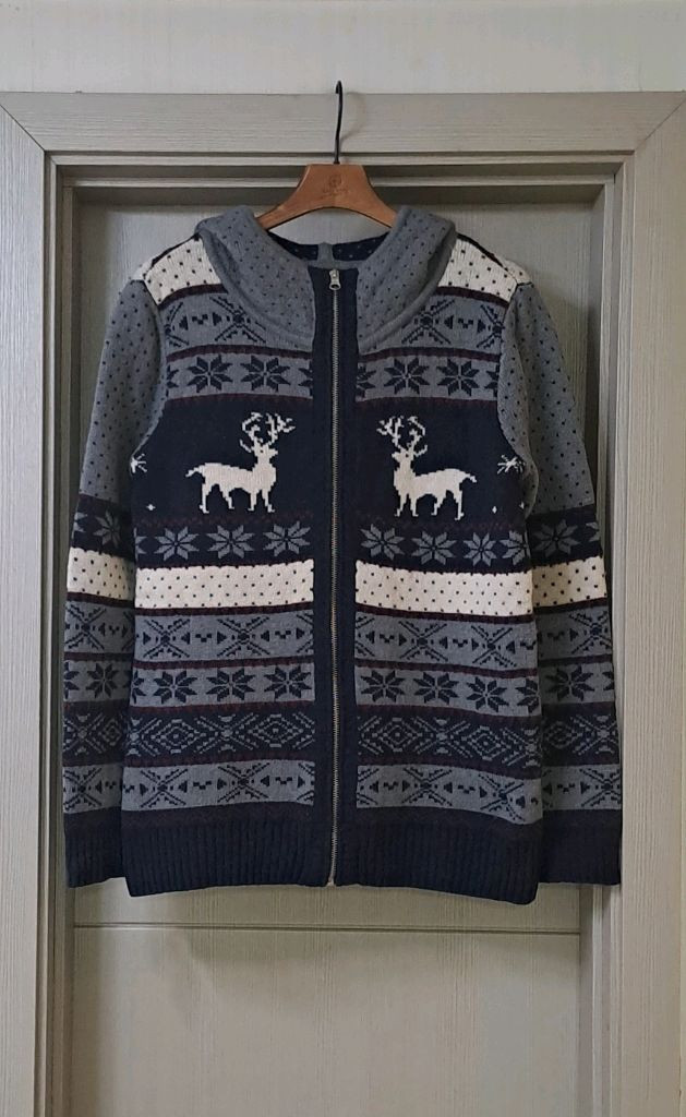 네이비컬러 신축성있는 모45% 세련된노르딕패턴 예쁜루즈핏 미쏘니트후드집업S사이즈입니다. 가슴단면 49 (상태좋은옷들만 판매합니다)