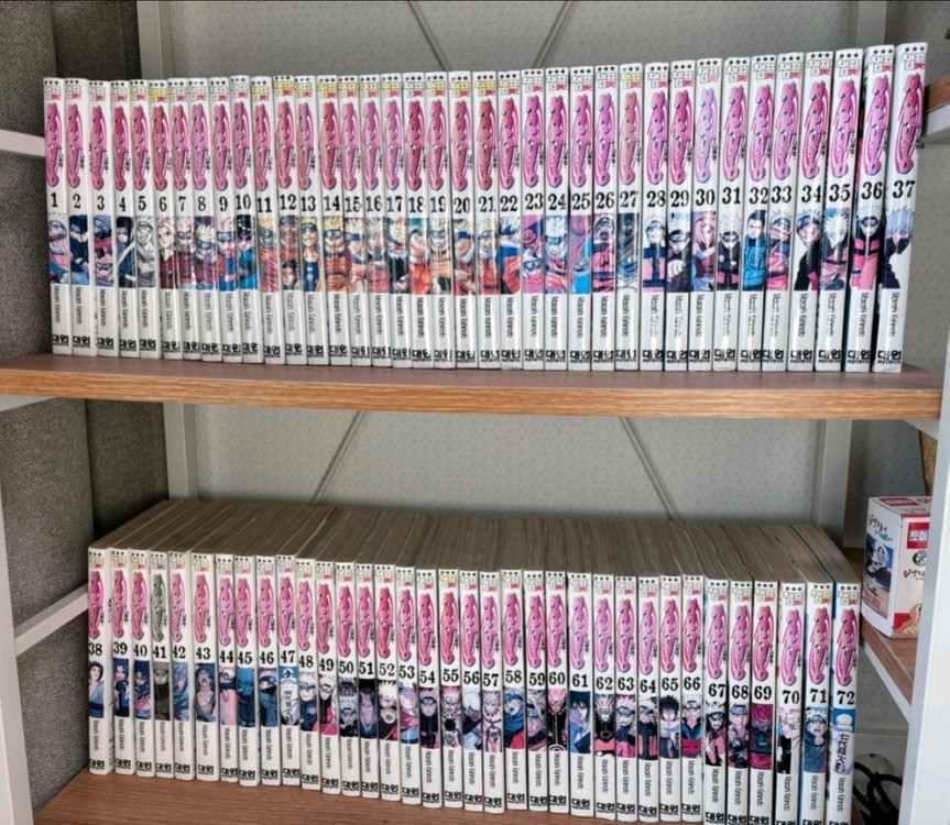 나루토 만화책 전권 팝니다. 창가에 보관하여 변색이 있지만 전면 표지는 멀쩡합니다. 상태 좋습니다! 무게가 있다보니 배송비 좀 높게 책정했어요!