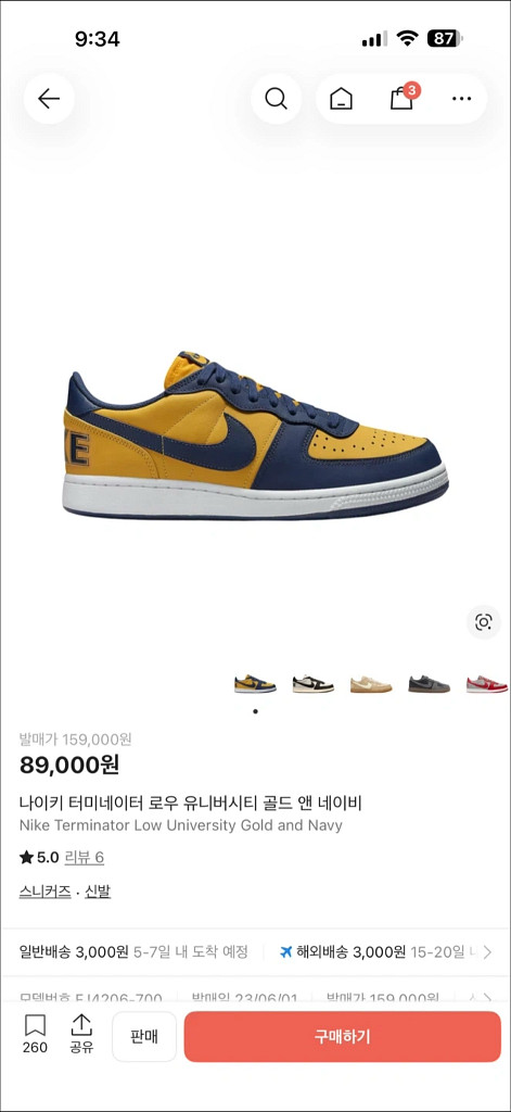 테미네이터 로우 골드앤네이비 컬러웨이입니다. 박스와 함께 깔끔한 상태로 보관되어 있어요. 클래식한 디자인의 인기 모델로 데일리 착용하기 좋습니다. 구매후 미사용하였고 텍,박스 다 그대로가지고 있습니다! 사용은 전혀 하지않았습니다! 사이즈270이고 크림기준 89,000원에 새상품 판매중 입니다.