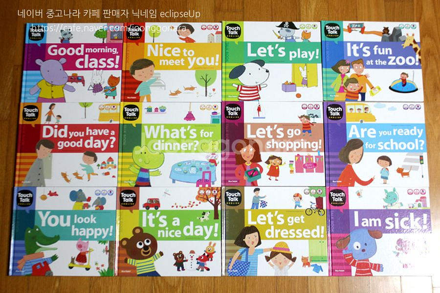집에 읽지 않는 책이 있어 판매합니다 사진 6장 참고 블루래빗터치톡잉글리쉬 토크북 총 12권 [총 정가 114,000원 (정가 한 권 당 9,500원)] 목록은 아래를 참고해주세요 01 Nice to meet you! 02 Good morning, class! 03 Let's play! 04 Are you ready for school? 05 Did you have a good day? 06 What's for dinner? 07 It's a nice day! 08 It's fun at the zoo! 09 I am sick! 10 Let's go shopping! 11 Let's get dressed! 12 You look happy! 책 안쪽 거의 읽지 않아 상태 좋습니다 그림도 예쁘고 재미있고 유익한 책입니다 구매 후 반품 및 환불불가