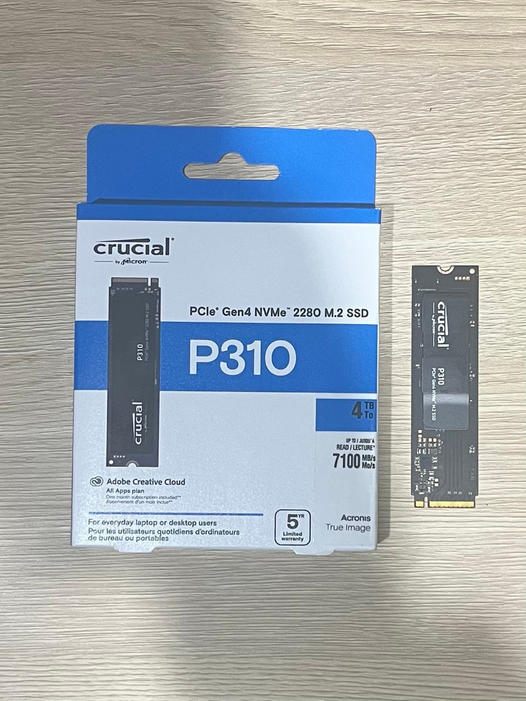 마이크론 Crucial P310 M.2 NVMe SSD 4TB 입니다. 구매 후 테스트만하고 사용하지 않아서 사용량 매우 적습니다. 안심결제로 결제하시면 안전하게 포장해서 보내드리겠습니다. 충분히 검색하고 고민해 보시고 구매하세요.