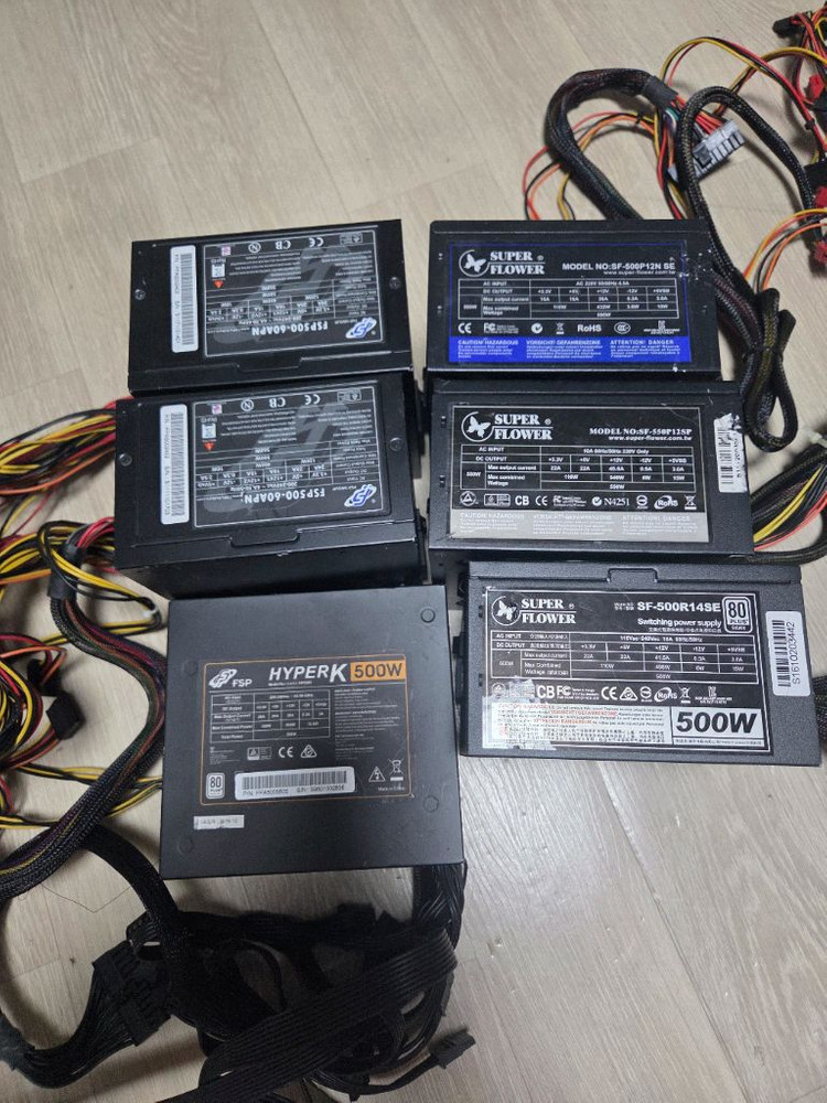 PC 파워 서플라이 6개 판매합니다 - Super Flower SF-500P12N SE 500W - Super Flower SF-550P12SP 550W - Super Flower SF-500R14SE 500W - FSP HYPER K 500 500W - FSP FSP500-60APN 500W, Max Peak Power 550W 청소되어있습니다 팬소음 없습니다 그저그런 똥파워 아니고 나름 네임벨류 있는 파워 입니다 본체만 드립니다 파워선 없으니 이점 꼭 확인바랍니다 택포함가이며 일괄거래 합니다 문의주세요