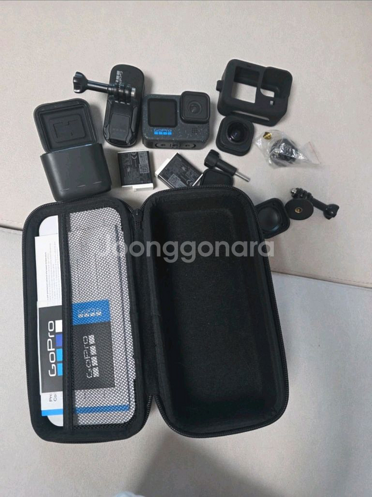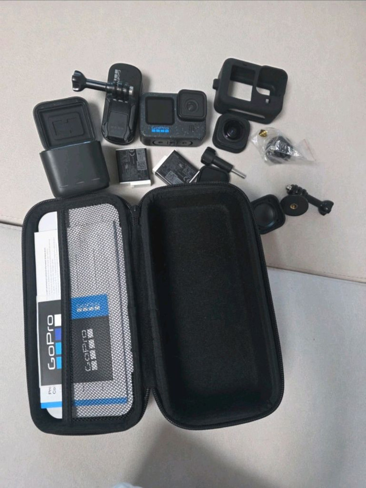 고프로 액션캠입니다 고프로 12 본품 실리콘 케이스 배터리2개 클립마운트 배터리 충전 케이스 1/4나사선 마운트 2개 *핸들 *차량용 흡착식 마운트 *바디마운트 유튜브로 영상 4개정도 만들때 잠깐씩 써봤습니다. 물에 넣은적없습니다. 주로 인스타360 플로우나 미러리스 카메라로 촬영하니 생각보다 잘 쓸일이 없습니다. sd카드 미포함입니다 수원직거래 위주로합니다 중고거래 얼마안해봐서 안전거래 할줄 모릅니다.