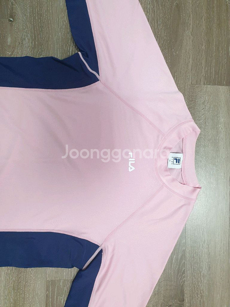 휠라 아이 레쉬가드 165사이즈입니다. 핑크색 바탕에 네이비색 라인으로 포인트를 준 디자인입니다. 쫀쫀한 재질이라 몸에 핏하게 붙어서 예뻐요. 저렴히 내놓아서 가성비최고.