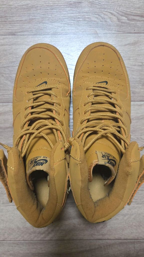 나이키 에어포스1 미드 '07 WB '된장' 농구화입니다. 전체적으로 사용감 없는 제품입니다. 끈에도 이염이 살짝 있으니 사진 확인 부탁드려요. 진짜 한 2번 3번 밖에 안 신었고요. 상태 진짜 좋습니다. 별도 문의 없으시면 바로 결제 부탁드려요. 위에 신발 앞에 뭐 이상한거 뺐는데 빼서 싸게 올립니다