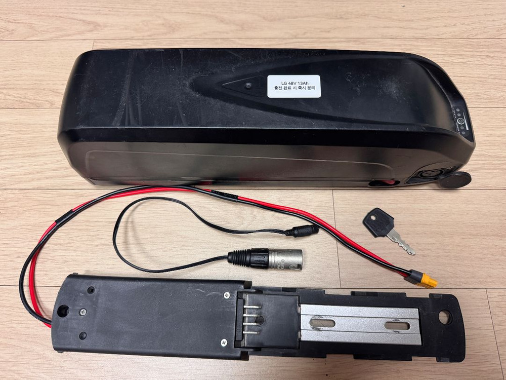 LG 48V KTX 배터리입니다. 원래 부릉이 전기자전거에서 사용하던건데 리필받고 사용안한겁니다. 타 자전거도 전압맞으면 사용 가능합니다. 구성품은 배터리, 배터리 거치대, 충전변환단자, 열쇠1개 풀세트입니다.