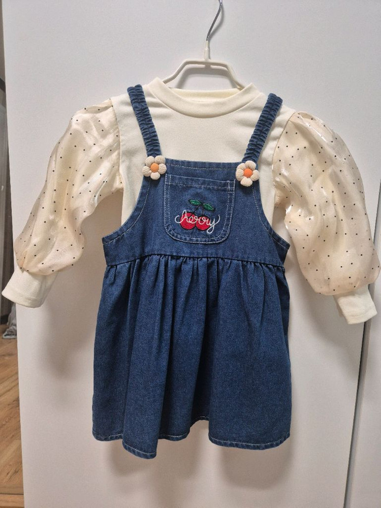 여아 데님원피스 벌룬티셔츠 일괄 100-110사이즈 귀여운 체리 자수가 포인트인 여아용 데님 원피스예요. 세트로 입거나 따로따로 활용하기 좋아요. 100사이즈로 100-110아이가 예쁘게 입을 수 있어요. 한번 잠깐 입었구 매우 깨끗 상태좋아요~ 아동용 데님 멜빵바지 원피스예요. 앞면에 체리 자수와 꽃 장식이 포인트이고, 아이보리 블라우스가 세트로 구성되어 있어요.