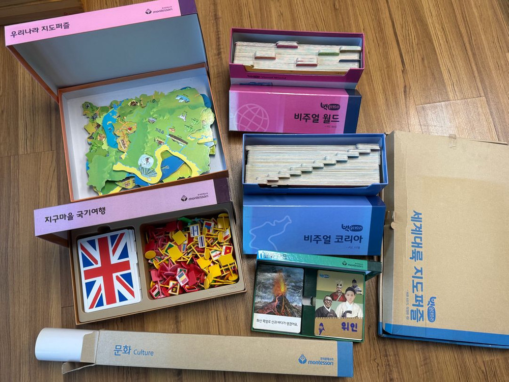 - 지구마을 국기여행 - 우리나라 지도퍼즐 - 문화 카드 - 비주얼 코리아 - 비주얼 월드 - 문화 스티커 - 세계대륙 지도퍼즐 - 우리환경 우리문화 ( 지도 ) 일괄로 판매하고 싸게 내놓아요 환불 어렵습니다 원가 진짜 비싼 거 아시죠..ㅠㅠ 저한테 싸게 구입해가세요~~ 사진도 구체적으로 많이 찍어서 올려뒀으니 끝까지 다 봐주세요! 진짜 구매하실 의향 있으신 분들 챗 주시면 영상까지 보내드릴게요 한국에서 아기 키운다면 몬테소리는 대부분 다 하시더라구요 실제로 도움도 많이 받았구요 아이들 발달에도 도움이 많이 될거에요 문화 스티커는 사용감이 있습니다 꼭 확인해주세요 택배도 가능하지만 택배비는 본인이 부담하셔야 됩니다 (택배비가 더 나올시 추가로 이체해주셔야 함)