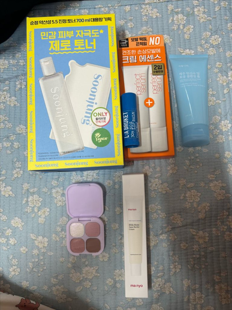 섀도우 팔레트는 발색만 봤어요 나머지 화장품들은 전부 새제품입니다~ 에뛰드 순수토너세트 27.08 순수에멀전 라부르켓 SOS 립밤 28.09 미장센 크림에센스 27.08 식물나라 탄산수 딥 모공 클렌징 폼 27.01 마녀공장 비피다 바이옴 아쿠아 베리어 크림 26.11