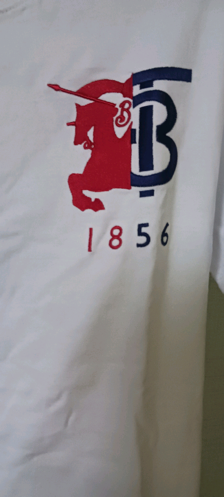 버 버. 리. 화이트 반팔티셔츠예요. 앞면에 레드와 네이비 컬러의 로고가 포인트로 들어가 있어서 깔끔하고 스타일리시해요.