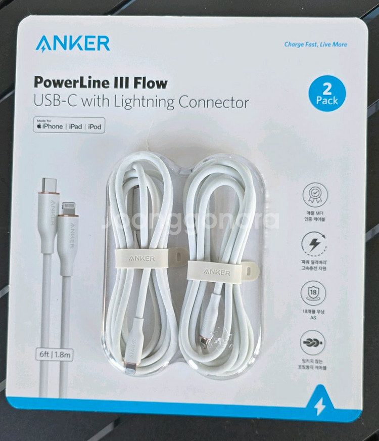 USB-C와 라이트닝을 모두 지원하는 고속충전 케이블 1.8미터 2개 세트예요. 아이폰과 애플기기 모두 사용 가능하고, 박스 포장 상태로 미개봉 새제품이에요 엉키지 않는 꼬임방지 케이블 30W 고속충전 지원