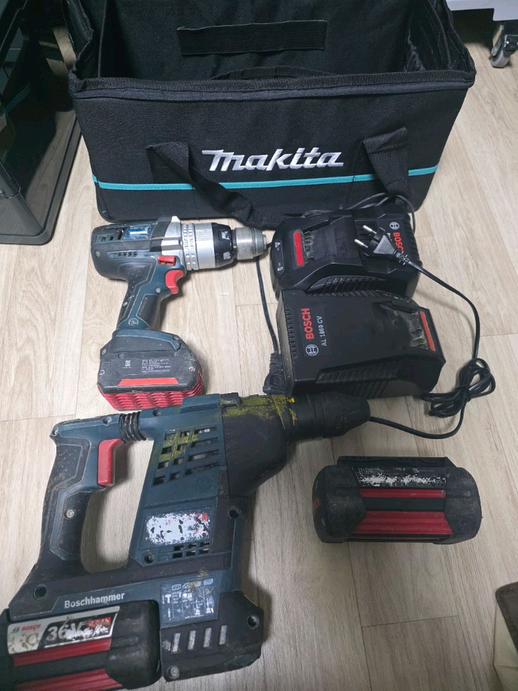 보쉬 전동공구 2종 일괄 판매합니다. 현장에서 힘 좋기로 유명한 36V 로터리 함마와 가정/현장 겸용 18V 드릴 구성입니다. 구성: 36V 로터리 함마 세트 + 18V 함마드릴 세트 (배터리, 충전기 포함). 마끼다 가방 포함 상태: 외관 사용감은 있으나 힘 넘치고 작동 아주 잘 됩니다. 배터리 효율도 문제없습니다. 가격: 48만 원 (일괄 우선) 공구 정리 차원에서 저렴하게 내놓습니다. 직거래 선호합니다.