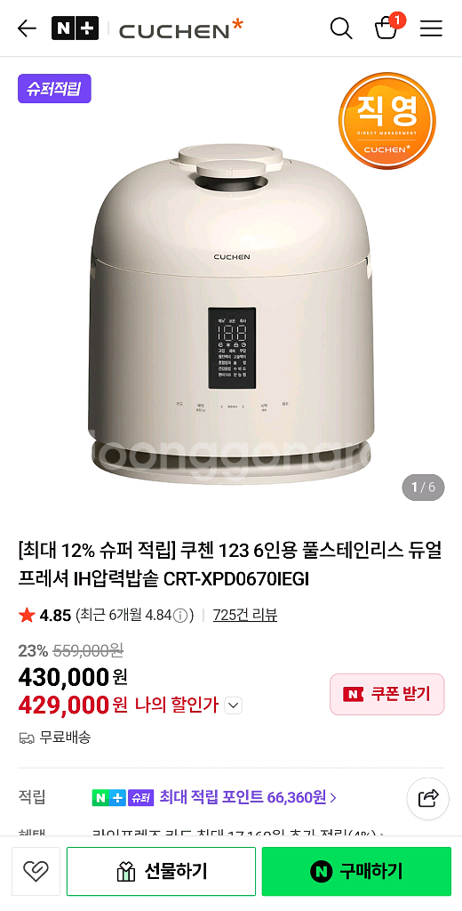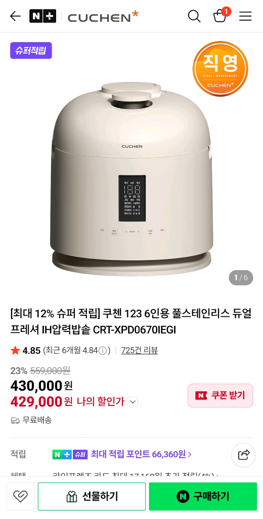 쿠첸 123 6인용 풀스테인리스 압력 밥솥 미개봉