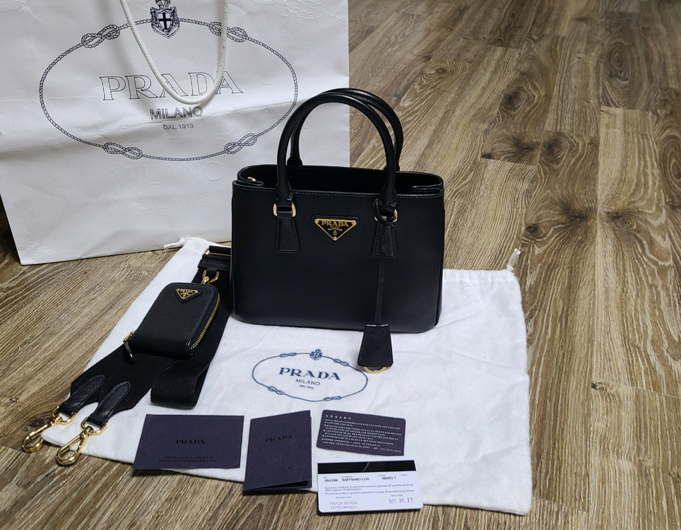 프라다 갤러리아 사피아노 스몰(미니) 1BA296 모델이고 당시 롯데백화점에서 360~370만원 정도 줬던 제품입니다. 현재 새 상품 기준 공홈, 백화점은 500만원 넘고 인터넷 최저가도 330만원 이상네요 사피아노 재질이라 고급스럽고 크로스끈 탈 부착 , 길이 조절 가능해서 크로스백, 숄더백 다 가능합니다. 크로스 스트랩에 미니파우치 작은 가방도 달려 있어 포인트 되고 이뻐요. 사이즈도 들고 다니시기 좋은 사이즈고 폭이 있어 나름 수납도 좋습니다:) 상태 또한 모서리 까짐도 없고 깨끗하니 상태 좋습니다. 구성품은 롯데백화점 개런티 보증 카드, 더스트백, 프라다 카드 등 있어요:) 찾아보시면 아시겠지만 기본 중고가만 150~170이상 하는 제품이에요. 좋은 가격에 올립니다.