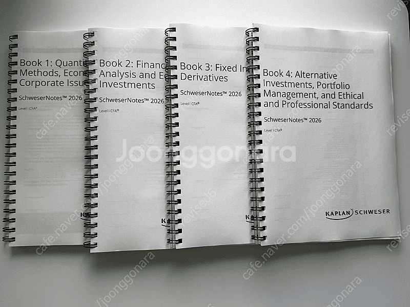 📢 제목에 "출판사+책 이름+저자”를 넣어 작성하면, 보다 빠른 판매가 가능합니다! 📢 게시글 작성 시 배송 방법에 “직거래”와 “내 위치” 설정할 경우, 보다 빠른 판매가 가능합니다! 2026 CFA Level 1 슈웨이저 전권+퀵시트pdf 제본 새상품 판매합니다. 1권~4권 그대로 제본 한것이며, >>가격: 7만원(택배비 포함)<< 직거래/ 택배 가능 정가 32만 8천원 주고 구매함. 입금 확인시 다음날 즉시 발송 🚨회원님의 거래 게시글을 노린 중고나라 운영진 사칭 피싱 사이트를 주의하세요🚨