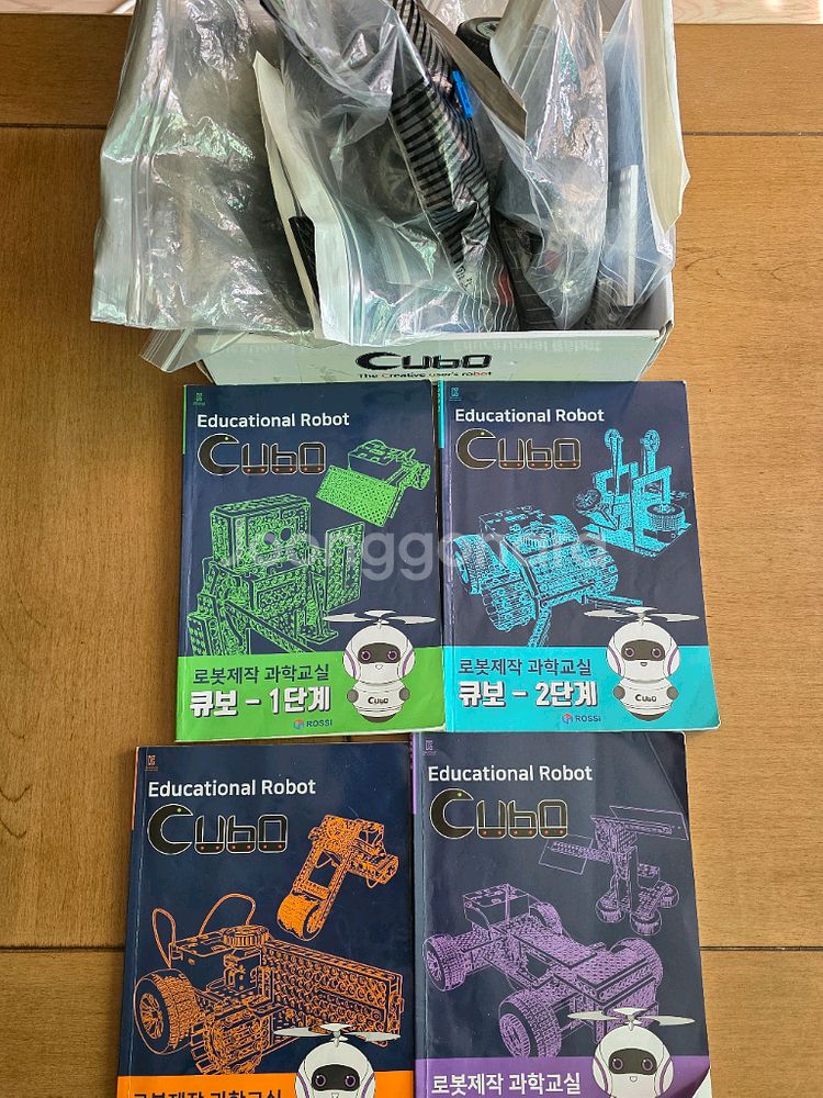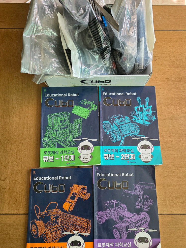 큐보 로봇 초등학교 방과후 교실에서 구매했구요 구매시 재료비별도로 8만원 넘게 냈었어요 1단계~4단계 입니다 레고 맞추듯 부품으로 맞추고 한책에 10개정도의 다양한 작품을 만들어볼수 있어요 16만원에 판매해요