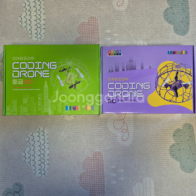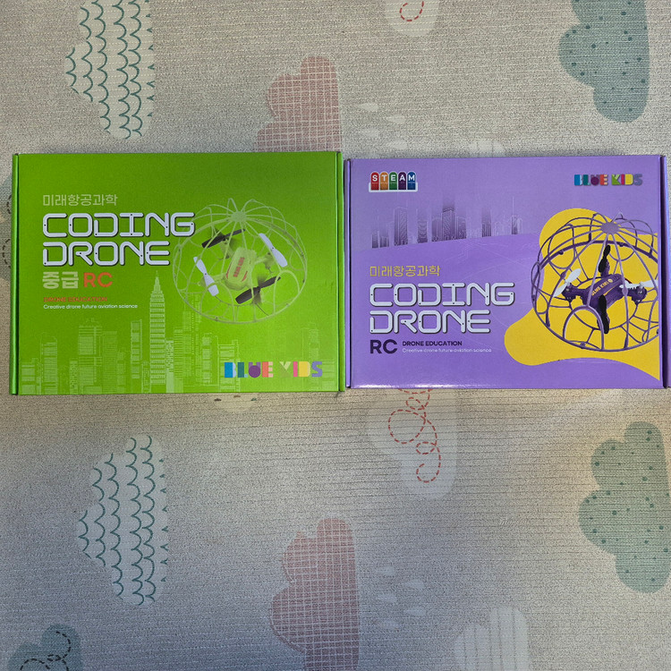 미래항공과학 코딩 드론 2개 (녹색, 보라색) 입니다 - 코딩 교육용으로 좋아요 - 드론과 컨트롤러, 충전 케이블 포함입니다 잘 작동합니다