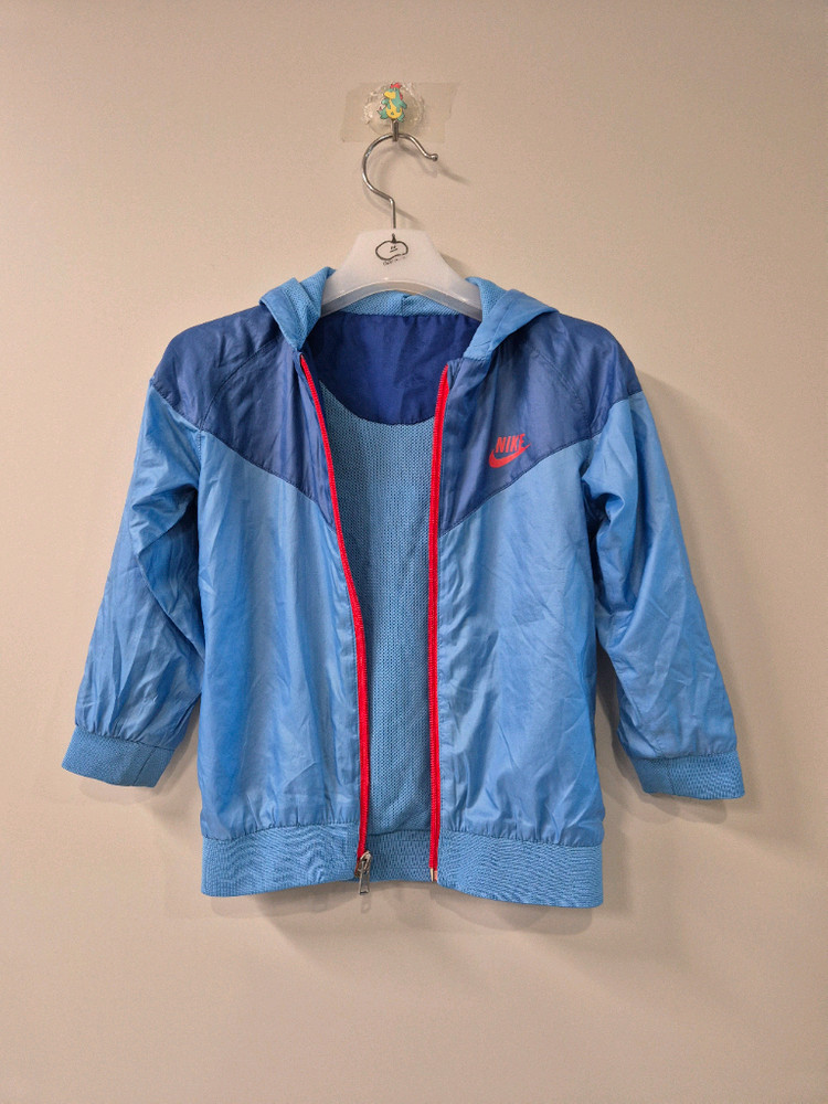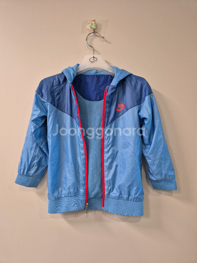 아동용 바람막이 자켓이에요. 100사이즈 블루와 네이비 컬러 조합이 예쁘고 후드가 있어서 실용적이에요. 전체적으로 깔끔한 상태로 보관되어 있습니다.