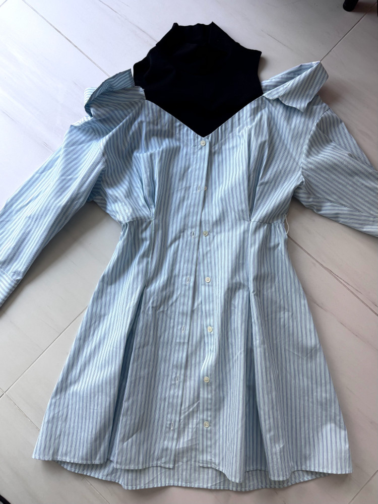 <마쥬 오프숄더 셔츠 원피스> 실착 3회 목은 폴라, 어깨 드러나는 오프숄더 셔츠 디자인 사이즈 34/ A라인 사진 그대로에요:) 한겨울빼고 다 잘 입을 수 있고 날씬해보이는 디자인인데 저는 개인적으로 바지를 더 자주입어서 내놓아요! ㅠ