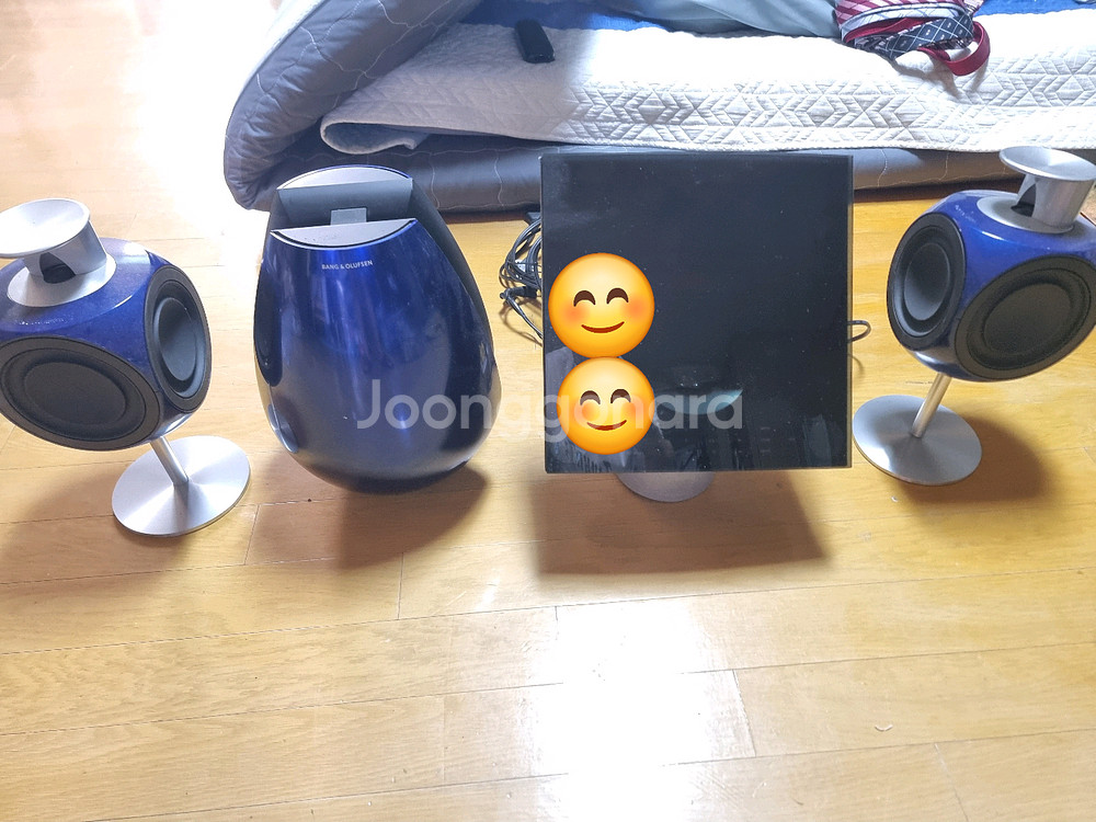 북셸프 스피커 한 쌍입니다. 블루 컬러에 실버 다리로 고급스러운 디자인이 특징이에요. 사용감은 있지만 작동 상태 양호합니다.