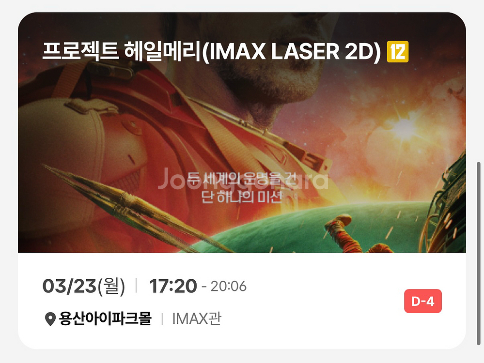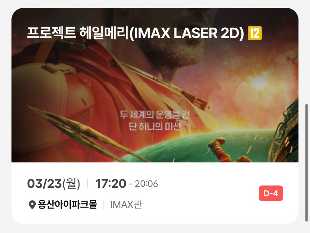 [정가 양도] 프로젝트 헤일메리 3/23(월) 용아맥 용산 아이맥스 g열 중블 1석