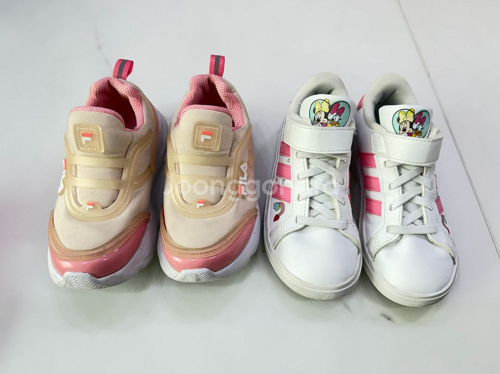 휠라 꾸미 운동화와 아디다스 디즈니콜라보 운동화 둘다 170사이즈입니다. 6세까지 신었어요. 둘다 상태 괜찮고, 깨끗히 세탁했고 가져가서 신기시면 되요. 단, 휠라 운동화는 세탁했더니 불 안들어와요; 휠라 7000원 아디다스 9000원 두개 같이 하면 15000원입니다. 부천 범박동 직거래/택배거래합니다. 챗주세요~^^