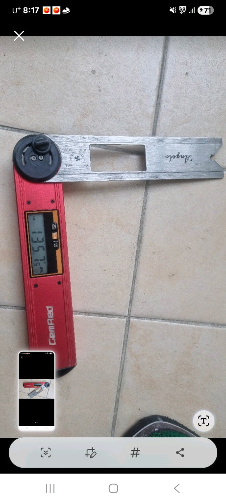 디지털 각도계입니다. LCD 디스플레이가 있어 각도 측정이 간편하고, 전체적으로 깨끗한 상태예요. 건설이나 목공 작업에 유용한 전문 공구입니다.