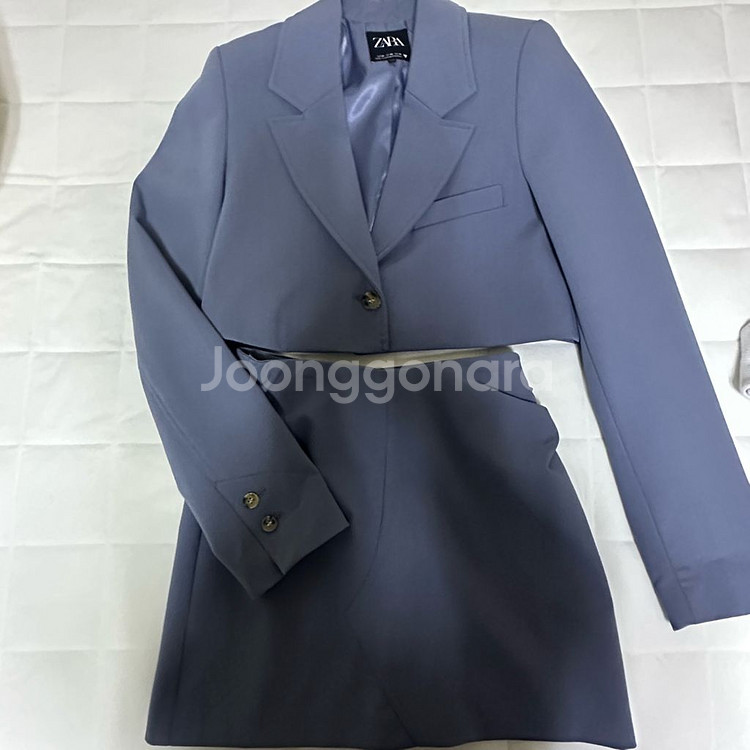 - 자라 투피스 셋업(자켓과 스커트 구성입니다.) - 색상은 뮤트한 블루 색상 - 자켓, 스커트 모두 xs사이즈 - 스커트 사이즈 표기된 택 한쪽 튿어졌어요 스커트는 좀 커서 허리만 수선했습니다 허리단면 30정도로 44~55초까지 추천드려요