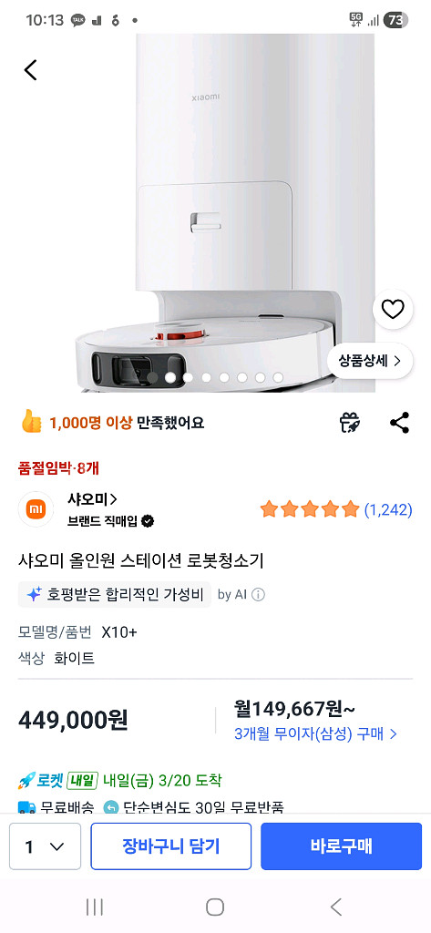 로봇청소기 새상품이에요! . AI 카메라와 자동 먼지통 비우기가 가능한 최신형 모델이라 정말 편리해요. 제품에 이상이 있는지 확인하고 검수만 한 상태이니 1 2회 사용으로 보시면 되고 거의 새 상품이라고 보시면 됩니다
