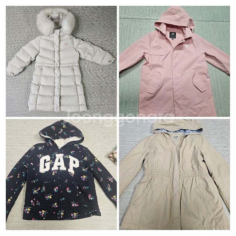 뉴발란스키즈 패딩 130 한파 두께 아니고 경량보다 약간 도톰정도에요. 뒷면 엉덩이쪽 작게 뜯김 있어요(사진첨부) 뉴발란스키즈 바람막이 130 갭키즈 10t 보세 바람막이 150(130정도 사이즈) 볼펜자국 약하게 있어요(사진첨부) 치크 가디건130이랑 바지 티 사용감 있어서 원하시면 같이 드려요. 사진상 오른쪽 바지 두개는 140~145정도 사이즈에요 일괄 택포5만