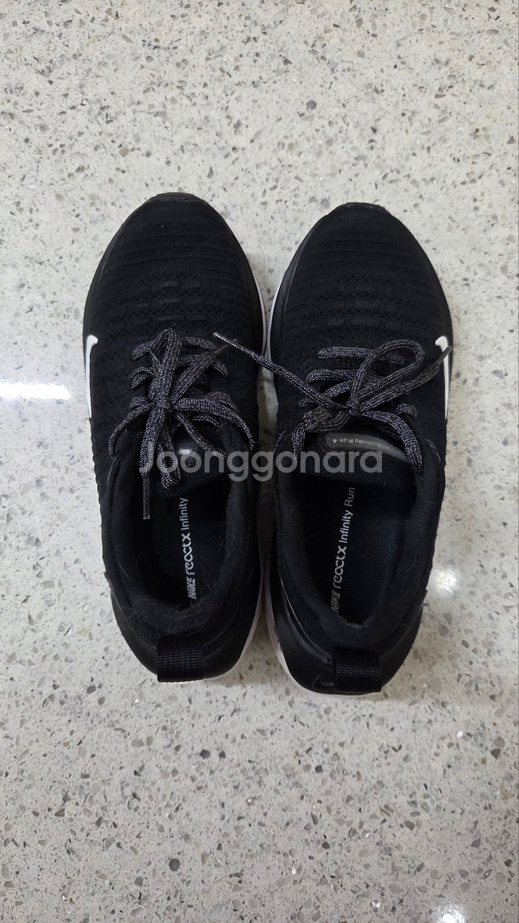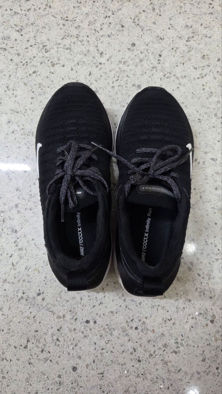 Nike 리액트X 인피니티 런 4 입니다. 블랙 컬러에 화이트 솔로 깔끔한 디자인이에요. 사용감은 있지만 전체적으로 양호한 상태입니다. 네고 없습니다.