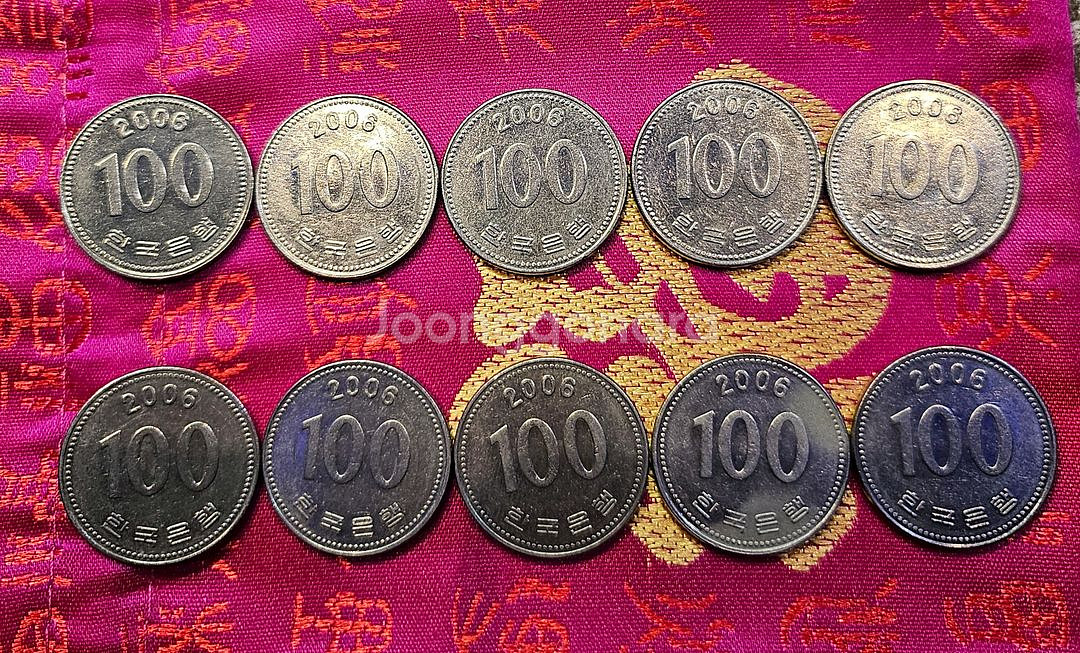 2006년에 발행된 100원 동전 10개 묶음입니다. 수집용으로 보관해 온 깨끗한 동전들입니다. 사진에서 보시는 것처럼 상태 좋습니다. 문의 없으시면 바로 안전결제해주시면 됩니다!