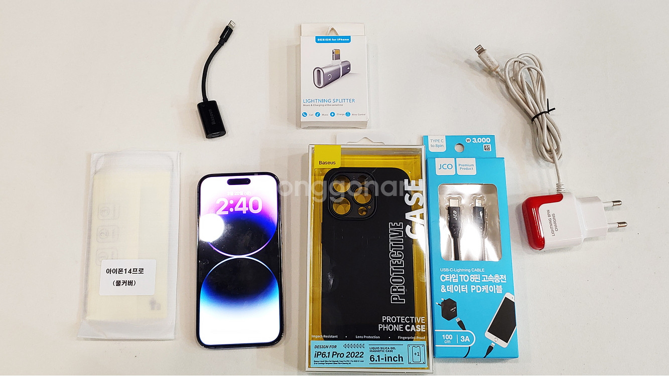 1- 아이폰 14 프로 256g 다양한 액세서리들이 함께 있는 세트예요. 충전기, 케이블, 보호필름 등 여러 구성품이 포함되어 있어서 바로 사용하기 좋을 것 같아요. 전체적으로 깔끔한 상태입니다. -색상 : 딥퍼플 ` 배터리 상태 : 83% - 구성품 - 1- 본체 아이폰 14 프로 256g 딥퍼플 2- 지문인식 풀커버 액정보호 강화유리 최근 셋팅 되어 있고 - 스페어가 추가로 하나더 있음 3- 베이스어스 리퀴드 실리카 겔 마그네틱 맥세이프 케이스 4- 맥세이프 무선 고속충전 보조배터리 5000mAh 5- 베이스어스 L36 애플 8핀호환 듀얼 이어폰 젠더 충전 음악 통화 6- 마이크용 라이트닝 8핀 to 3.5mm 듀얼 확장 충전 젠더 7- 애플인증 MFI 고속충전 케이블 C to 8핀 8- 아이폰 충전기 어뎁터 9- bob 맥세이프 무선충전기 전용 투명 TPU 케이스 010-5360-7565