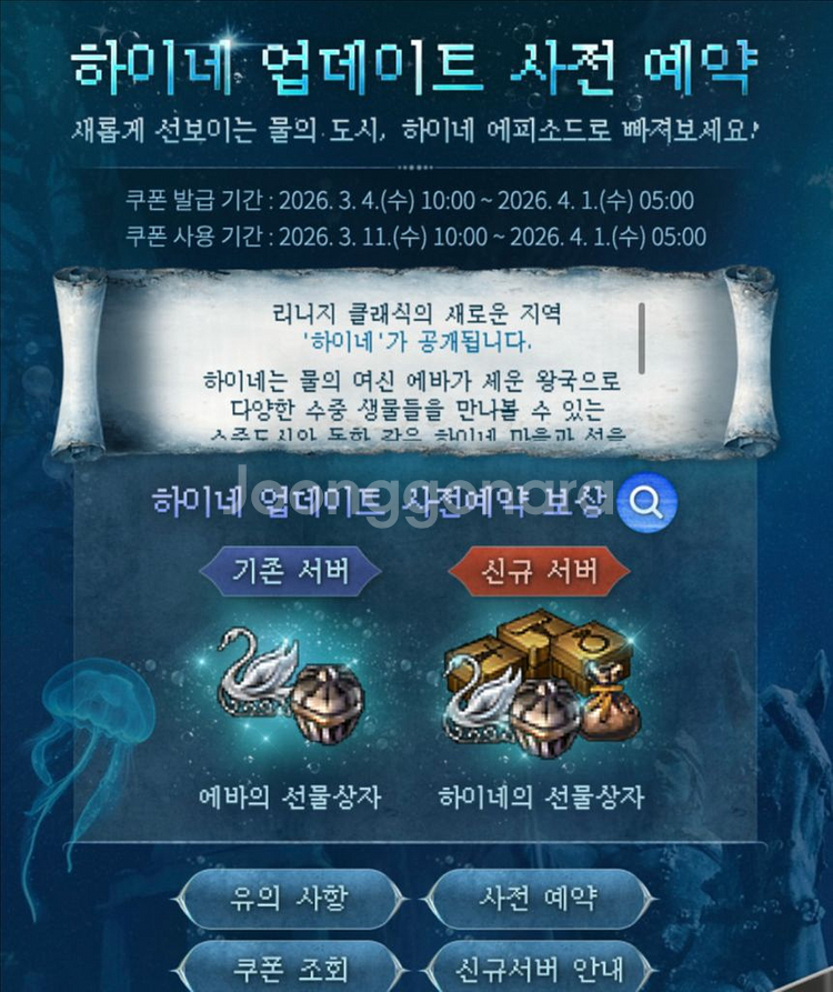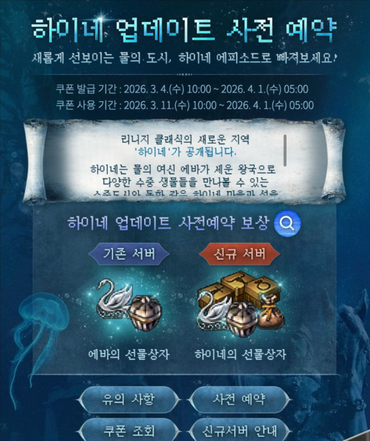 개인정보(거래정보)를 주고받는 행위는 사기에 노출될 수 있으므로 즉시 중고나라로 신고해 주세요리니지클래식 2차 사전예약쿠폰(에바+하이네) 세트로 세트당1,900원 팝니다. 33장 보유중입니다.