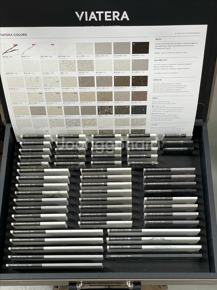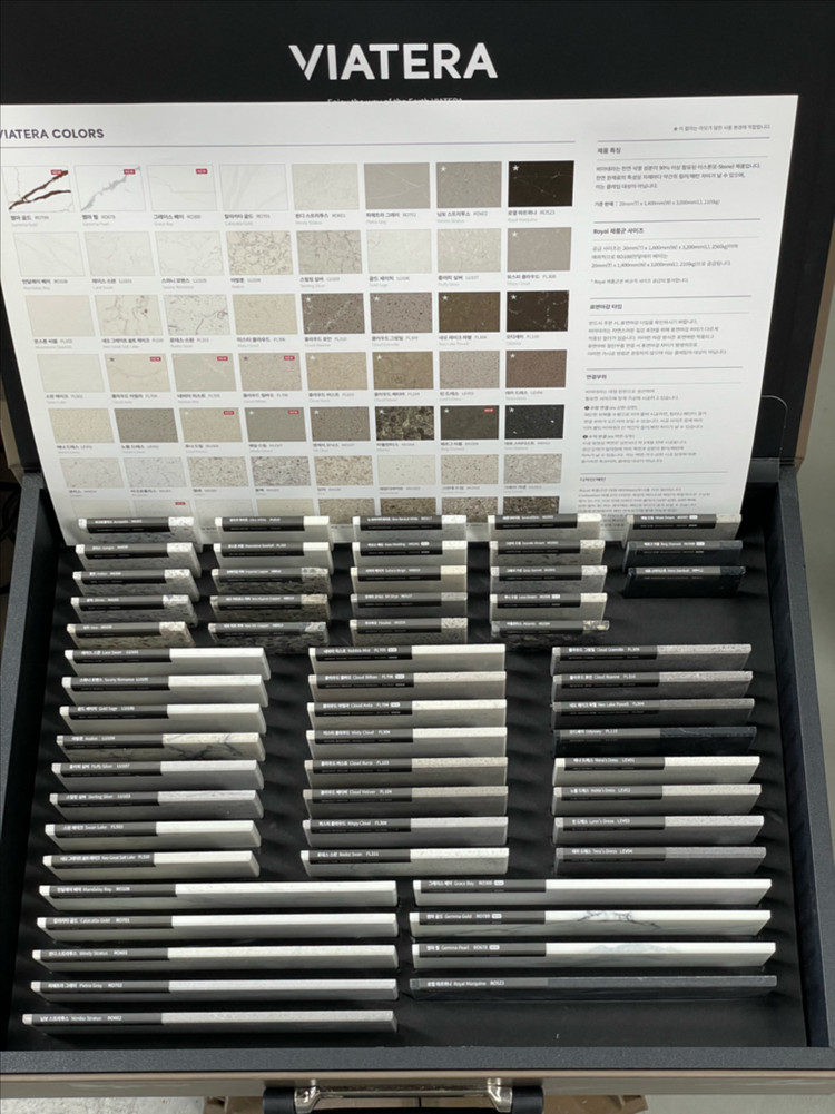 LX 하우시스 비아테라 Viatera 이스톤 샘플북 인조대리석 엔지니어드스톤 샘플북 팝니다. 스톤 샘플과 설명서 들어 있습니다. 손잡이가 있고 무겁습니다. 샘플들은 사용한적이 없어서 새것 같습니다.