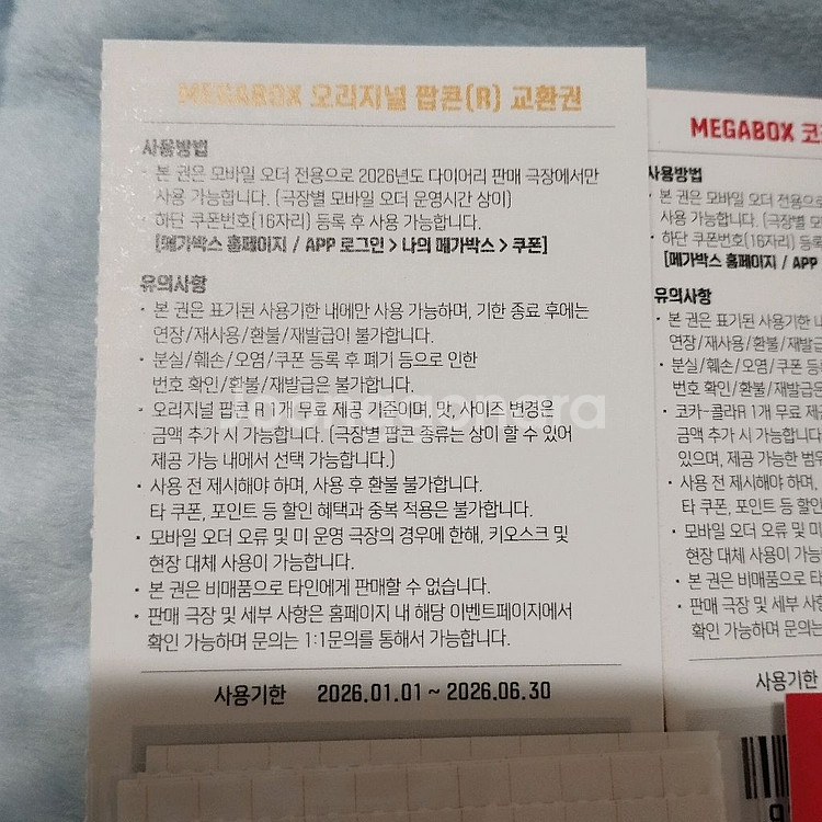 메가박스 매점쿠폰 브아이피 러브콤보 팝콘 탄산 콤보4000 할인쿠폰 다이어리 쿠폰 팝콘 탄산 나초할인쿠폰 브아이피 쿠폰 2/28까지 보유수량 팝콘 3000 ㅡ1개ㅡ판매완료 러브콤보 8500 ㅡ1개ㅡ판매완료 콤보4000 할인쿠폰 1500 ㅡ4개 매점이나 키오스크에서 사용하시면 되세요 등록은 안됩니다 다이어리 쿠폰 (구매전 사용지점 문의요망,앱에 등록후 사용) 팝콘 6/30 까지 3000 탄산 6/30 까지 1500 세트시 4000 1장 금액입니다 첨부된 사진에 유의사항 확인 후 챗주세요 본문외 불필요한 질문 사양합니다. 네고 답신 안해요 핀번호 노출후 취소 ,변경 환불 불가하니 신중한 구매 부탁드립니다