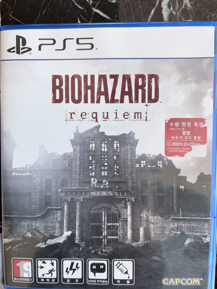 PS5 바이오하자드 레퀴엠 케이스와 디스크 모두 깨끗한 상태로 잘 보관되어 있어요. 코드 사용.
