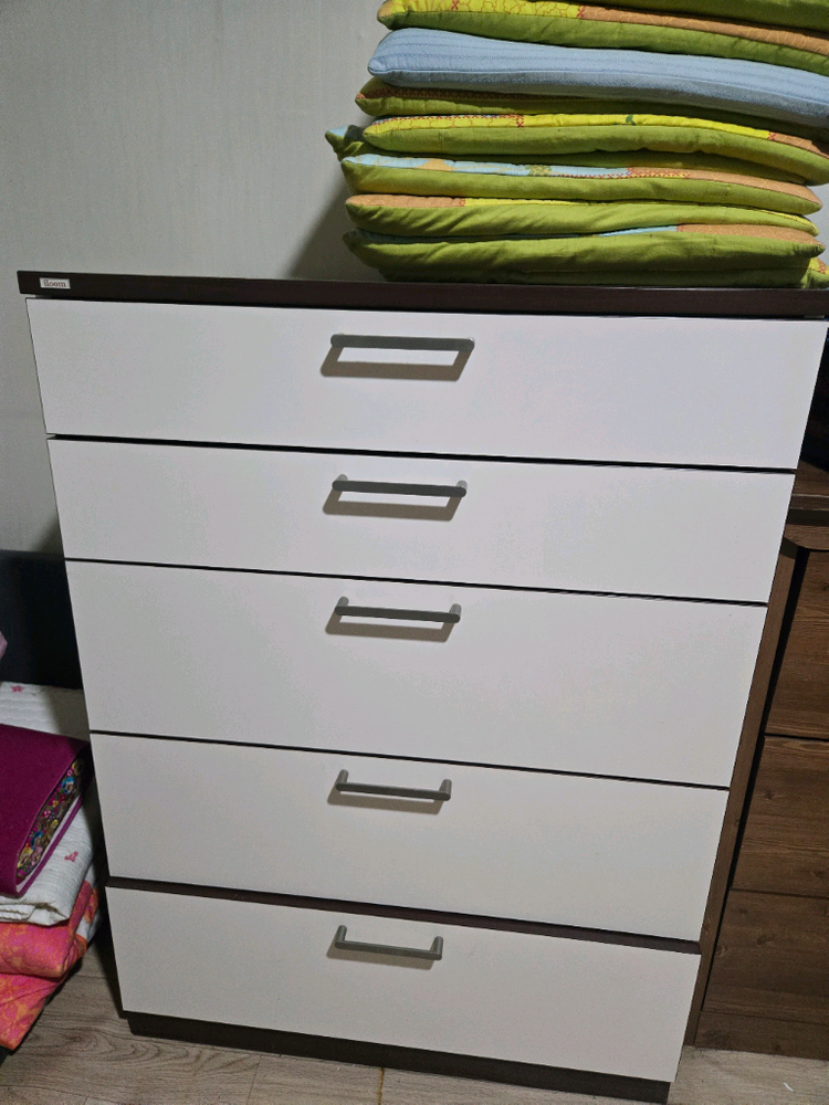 깔끔한 화이트와 브라운 조합의 5단 서랍장이에요. 상태 양호하고 수납공간도 넉넉해서 실용적입니다. 가격 내려서 판매하니 관심 있으시면 연락주세요!