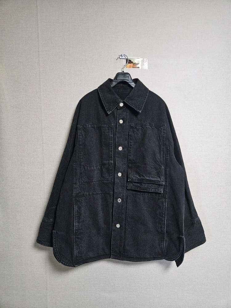 우영미 블랙 데님 워크 자켓입니다 넉넉한 오버핏으로 편하게 입을 수 있고, 캐주얼한 디자인이라 어디든 잘 어울립니다 사이즈는 46입니다 67×79