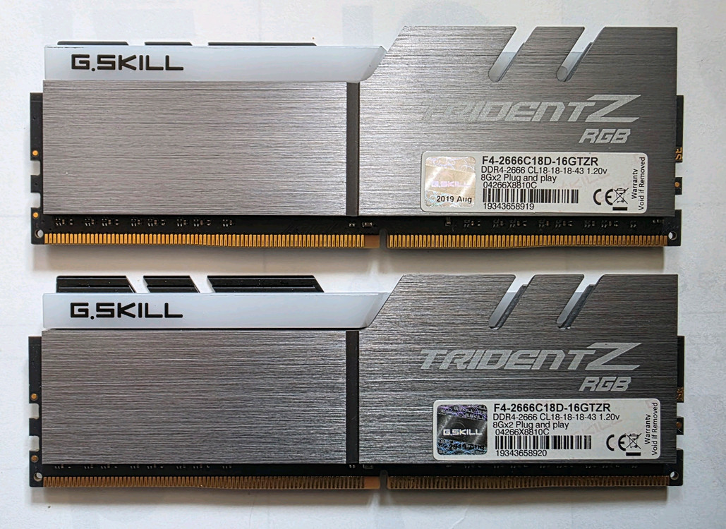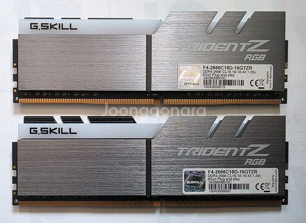 G.SKILL TRIDENT Z RGB F4-2666C18D-16GTZR 입니다 지금까지 아무 이상없이 잘 사용하던 메모리입니다 다른 문의사항 없으시면 바로 안심결제 하시면 우체국택배로 보내드립니다.