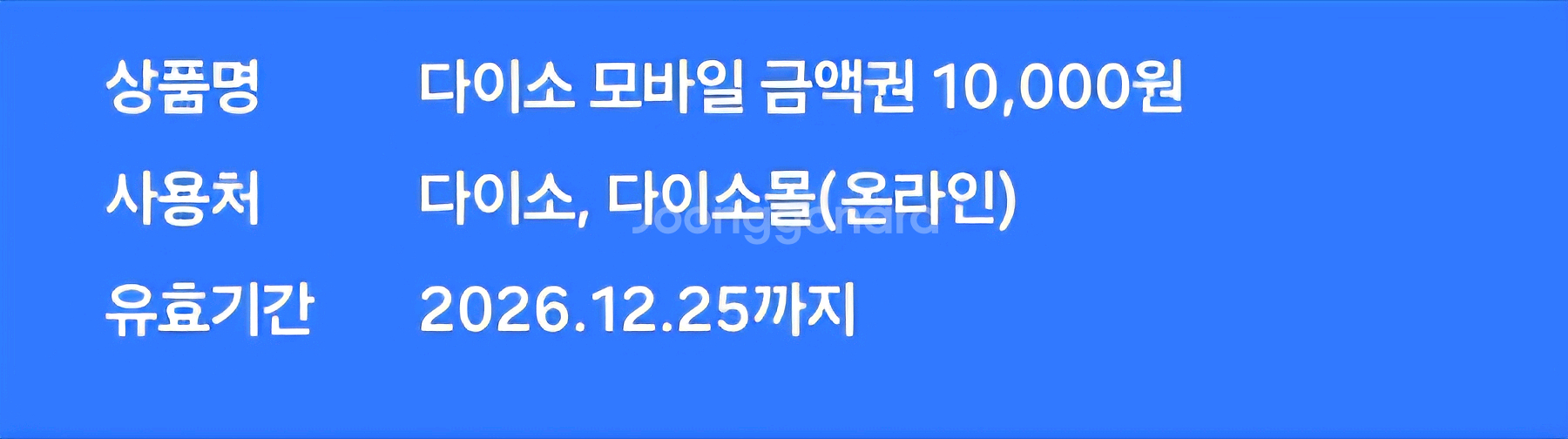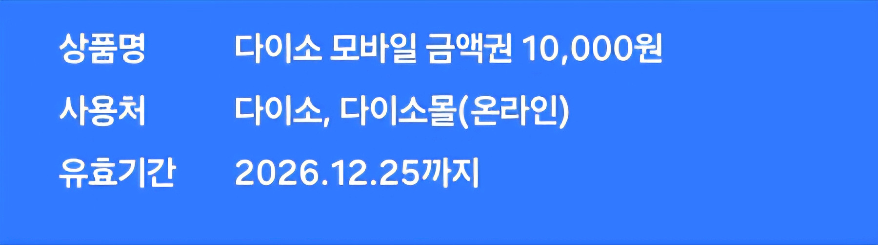 다이소 모바일 금액권 10,000원권 판매해요. 다이소 매장이나 온라인에서 사용 가능하고, 2026년 12월 25일까지 사용 기한이 남아있어요.