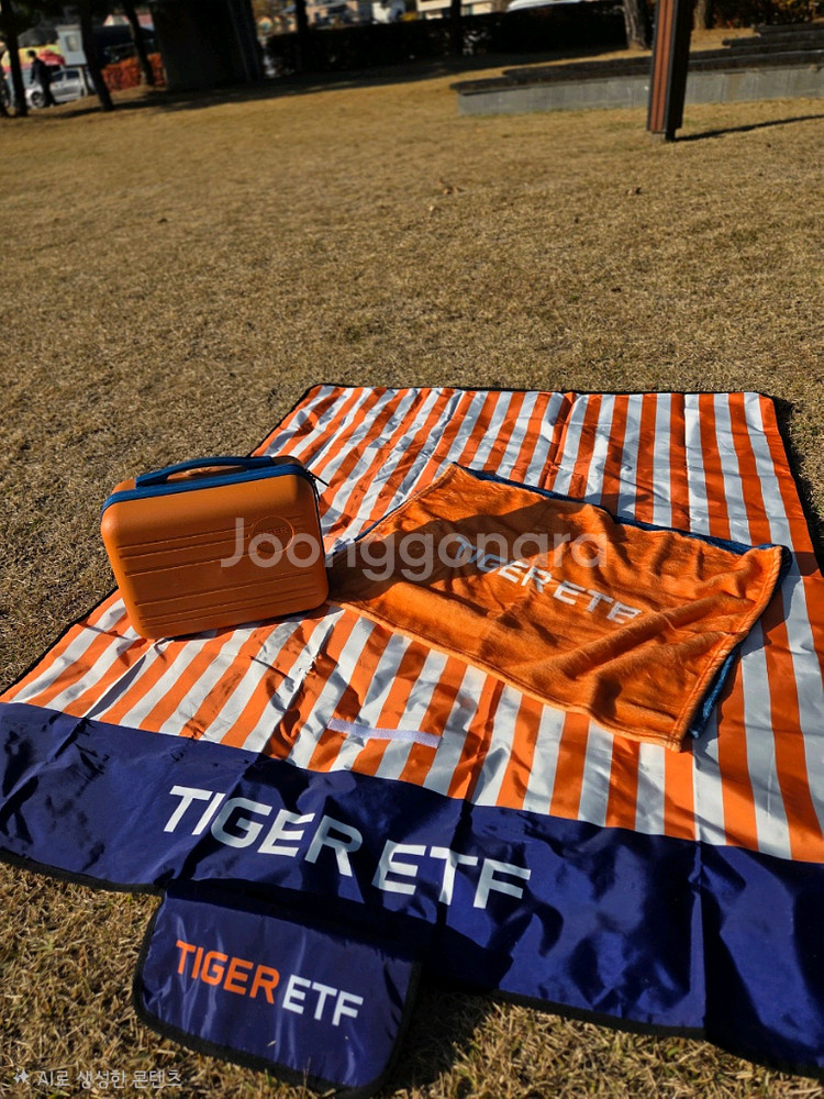 TIGER ETF 굿즈 세트입니다~ 오렌지색 미니 캐리어와 담요, 비치타올로 구성되어 있어요 - 캐리어 내부에는 파티션과 망사 포켓이 있어 수납이 용이합니다 - 담요와 비치타올은 새 제품 그대로 비닐 포장되어 있습니다 여행이나 캠핑 갈 때 유용하게 쓰일 것 같아요!