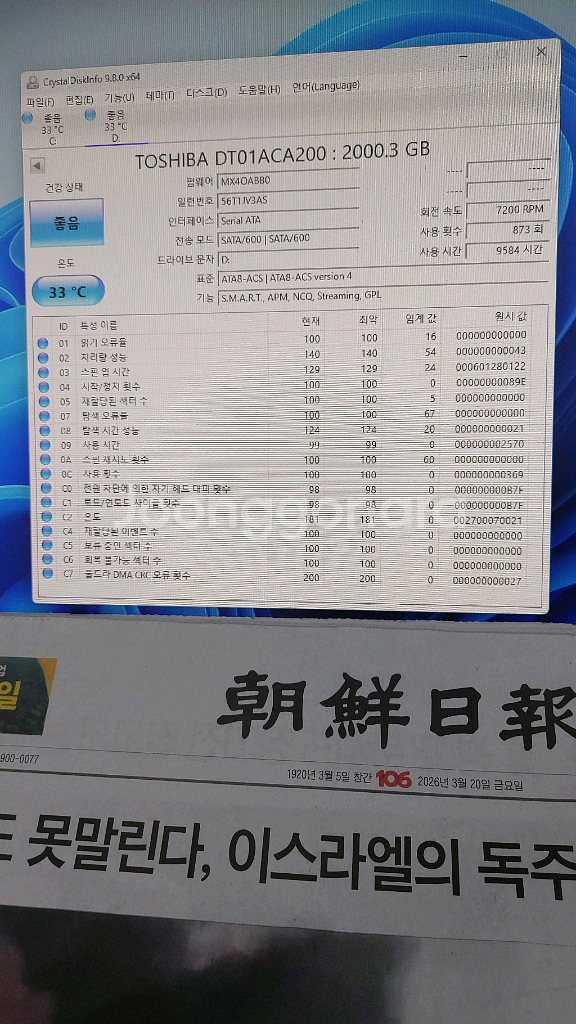 도시바(TOSHIBA) 2TB 하드디스크 판매합니다. (모델명: DT01ACA200) 일반적인 5,400RPM 저속 모델 아니고, 7,200RPM 고속 모델이라 HDD 중에서 속도 제일 잘 나오는 제품입니다. 사용 시간: **9,584시간 (1만 시간 미만)**으로 연식 대비 사용량 적습니다. 건강 상태: CrystalDiskInfo 점검 결과 '좋음' 확인 (배드섹터/오류 전혀 없음) 반품불가 충격에 예민한 부품이라 파손 면책에 동의하시면 반값택배 가능합니다 예약안받고 가장빨리 거래가능하신 분과 거래원합니다 판매자의 다른상품 보시면 hdd ssd 많이 판매중인데 여러개 구입시 네고 가능 합니다~