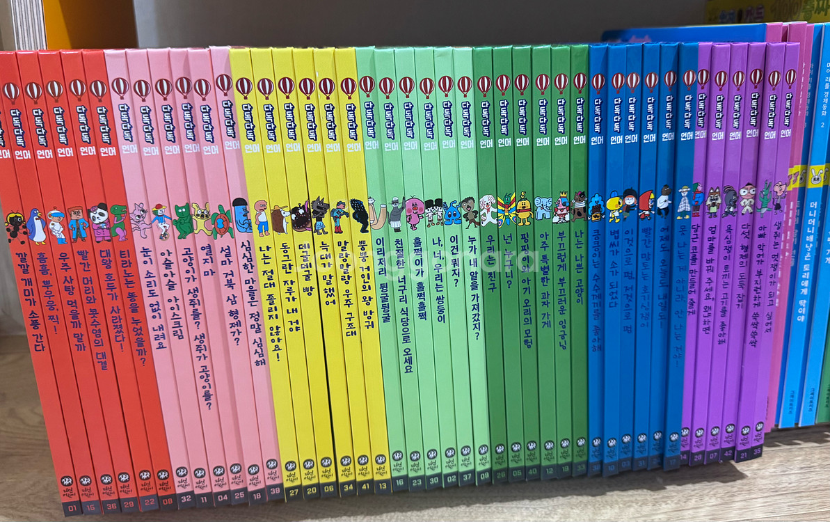 다독다독언어 전권이구요. 구매후 3권? 4권 한두번 읽은게 다라서 진열만 해놓았어요ㅠ 빛바램없고 깨끗합니다. 배송중 사진에서와 같은 3권 미세한 찍힘? 같은거 확인해주세요. 부록 모두 미사용. 본박스에 담아드립니다🩵 책상태에 비해 정말 저렴하게 내놨다고 생각합니다^^