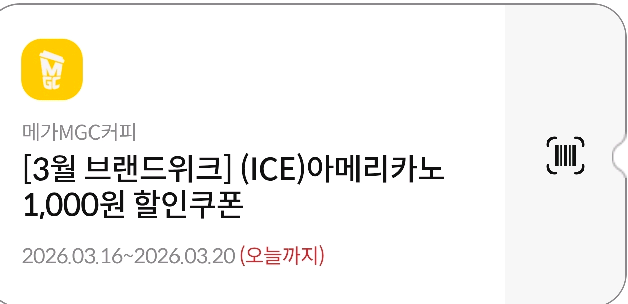유효기간 : ~오늘(3/20) 사실상 1000원 금액권 통신사할인과 중복적용하면 좋습니다. (통신사 할인 선결제 후 본 쿠폰 적용) 바코드 전송 후 환불은 불가해요