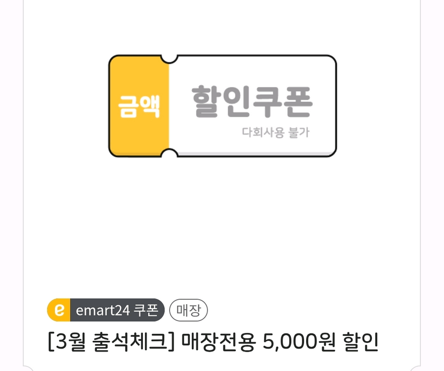 개인정보(거래정보)를 주고받는 행위는 사기에 노출될 수 있으므로 즉시 중고나라로 신고해 주세요이마트24 매장에서 사용 가능한 5,000원 할인쿠폰입니다 2026년 3월 25일까지 사용 가능합니다
