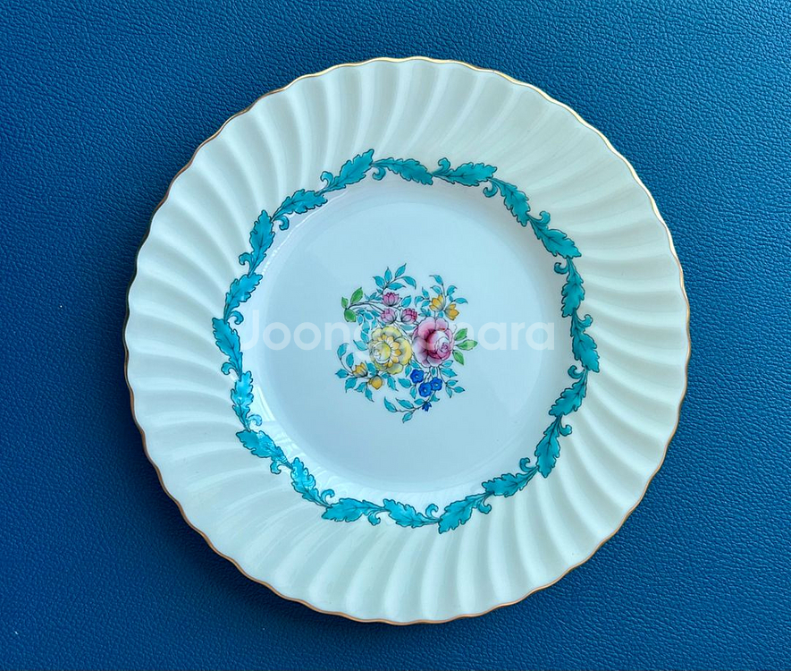 1940년대~1950년대 영국의 유명 도자기 브랜드인 민튼(Minton)사에서 생산한 아드모어 패턴 브레드 앤 버터 플레이트(Bread and Butter Plate) 또는 사이드 플레이트입니다. 이 제품은 민튼 특유의 화사한 꽃다발(Floral Bouquet) 센터 피스와 청록색(Teal/Turquoise)의 월계수 잎 테두리, 그리고 물결무늬(Fluted) 쉐입이 특징인 아주 우아한 라인입니다. 특히 개인 앞접시나 디저트용으로 가장 손이 자주 가는 사이즈(13cm)로, 과일이나 작은 빵, 또는 마카롱, 타르트, 조각 케이크, 쿠키 등을 담는 용도로도 쓰임새가 다양하답니다! ☺️ 컨디션 매우 좋습니다.^^ 마지막 사진은 AI를 활용한 이미지 컷입니다. 모두 여섯 장 보유 중이며, 개당 가격입니다. <사이즈> 지름: 13cm made in England ➡️ 칩이나 크랙, 크레이징 없이 상태는 매우 좋습니다만, 그 당시 도자기 생산 공정시에 생긴 흔적들(깨점, 핀홀, 색묻음, 금장스침 등)이 보일 수 있습니다. ➡️ 다른 물건도 함께 올려놓았으니 둘러보세요^^