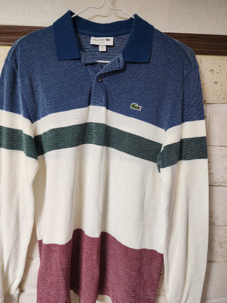정품 라코스테 스트라이프 폴로셔츠예요. 네이비, 화이트, 그린, 버건디 컬러가 조화롭게 배색된 디자인이 정말 예뻐요. 상태 양호하고 깔끔하게 관리되었습니다. 사이즈 95