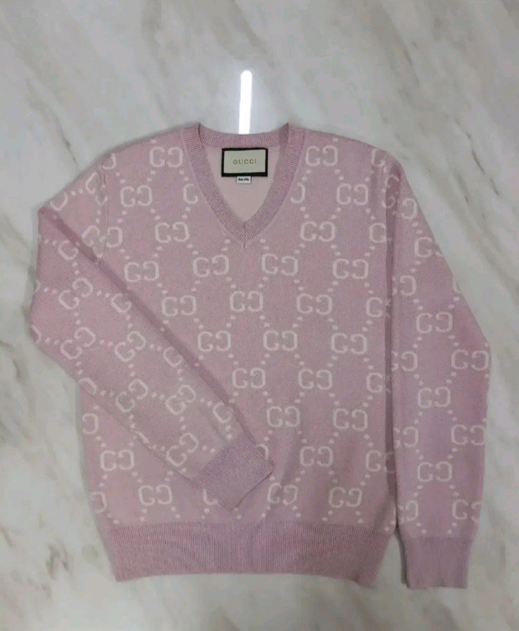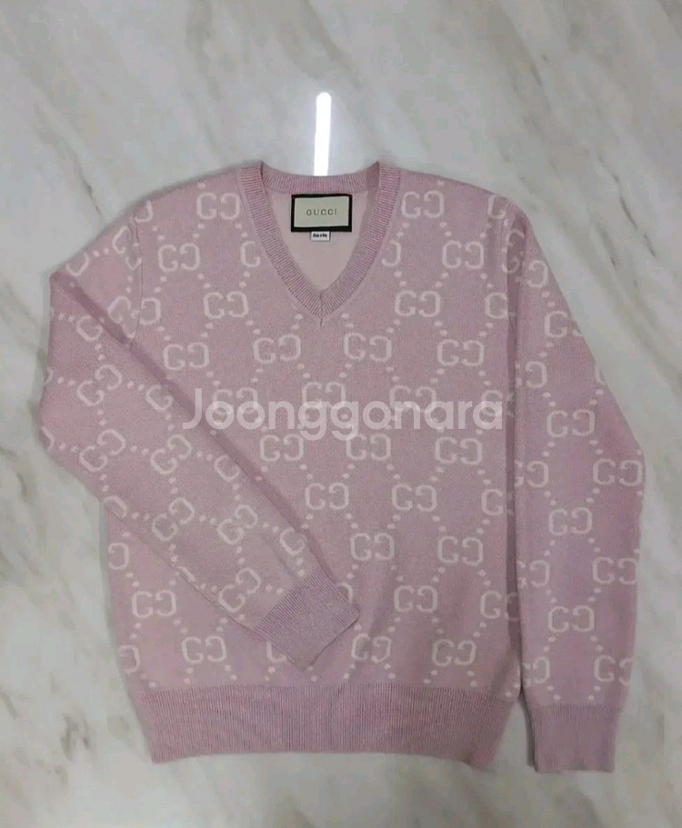 구찌 핑크색 니트 스웨터예요. 화이트 GG 로고 패턴이 전체적으로 들어가 있어서 고급스럽고 예뻐요. 상태 양호하고 깔끔하게 관리된 제품입니다.