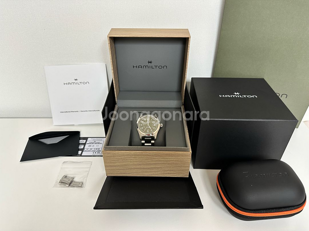 개인정보(거래정보)를 주고받는 행위는 사기에 노출될 수 있으므로 즉시 중고나라로 신고해 주세요해밀턴 카키필드 오토 38mm 그린 다이얼 시계 팝니다 시계 보호 비닐도 뜯지 않은 완전 새상품입니다. 카키필드의 묵직함과 세련된 그린 다이얼이 매력적인 제품입니다. 문의 없으시면 바로 안전결제해주시면 됩니다!